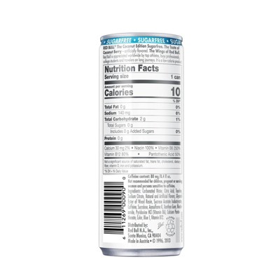 1 ml 100 ml 250ml. There are 20 calories in 1 can 12 oz of Red Bull Red Bull Sugar Free 12 oz. The Blue Edition - Red Bull.